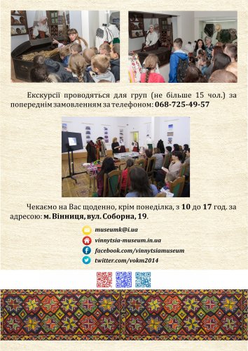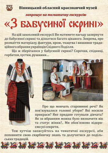 На цій захопливій екскурсії Ви матимете нагоду зазирнути до бабусиної скрині та дізнатися багато цікавого. Зокрема, про розмаїття матеріалу, фактури, крою, ткацтва і вишивки традиційного вбрання українців Східного Поділля.