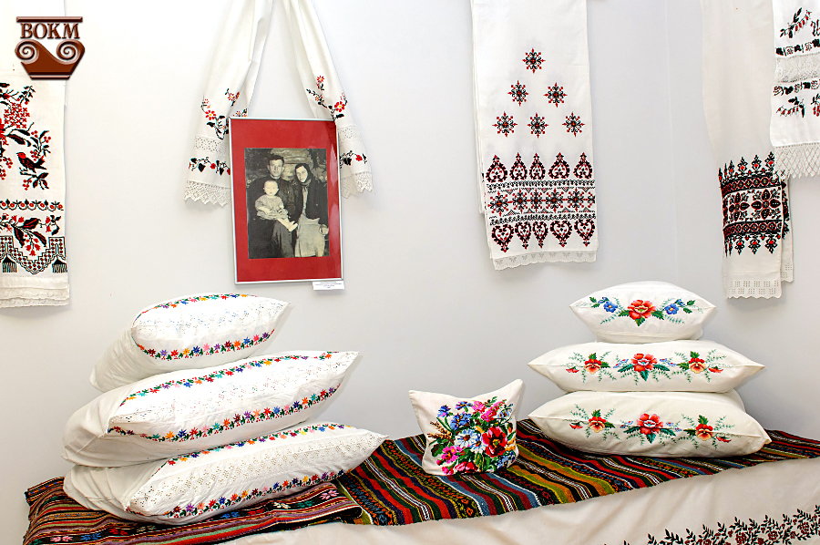 Усі вишиті речі, представлені в експозиції, оздоблювали хату Шуляк Марії Іванівни. Інтер’єр хати можна побачити на фото.