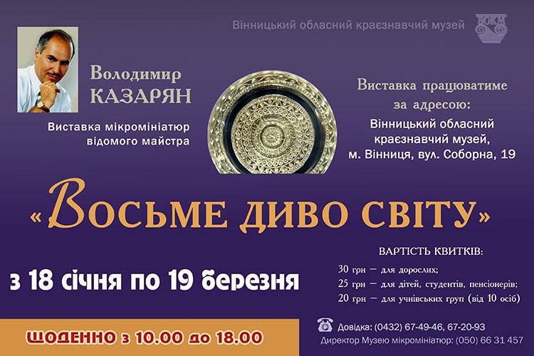 17 січня у Академічній залі Вінницького обласного краєзнавчого музею відбулось відкриття унікальної виставки мікромініатюр відомого майстра Володимира Казаряна "Восьме диво світу". На виставці представлені шедеври мікромініатюрного мистецтва, що вважаються неперевершеними творіннями рук людських!