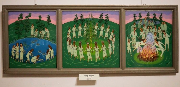 Наша виставка розпочинається з презентації весняних свят – Великодня, Трійці, далі потужний блок про овіяне містикою Івана Купала, що за реформованим церковним календарем відзначається 23 червня, поєднуючись з днем літнього сонцестояння, що має цілу низку ритуальних дійств і потужну фольклорну основу. Свято Спаса надихнуло митців теплими спогадами дитинства, щедротами подільської землі.
