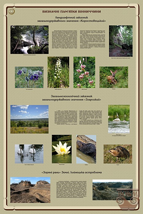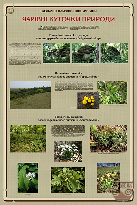 «Чарівні куточки природи». Цей розділ розповідає про природничі «перлинки» Вінниччини – ботанічні, загальнозоологічні та ландшафтні заказники, геологічні та ботанічні пам’ятки, «зоряну рану» – Іллінецьку астроблему. Крім цікавої та пізнавальної інформації про мальовничі куточки Подільської природи, глядач може дізнатися про мешканців лісів та водоймищ, особливості клімату та ландшафту, лікарські рослини тощо.