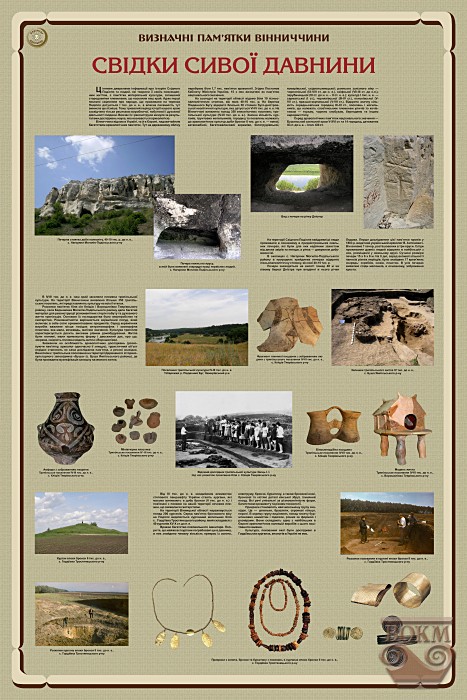 «Свідки сивої давнини». В Україні та Європі Вінниччина відома надзвичайним багатством археологічних пам’яток. На державному обліку в області перебуває близько 1 700 пам’яток археології, з них 19 — національного значення. У цій частині йдеться про палеолітичну стоянку (40-10 тис. років тому) поблизу с. Нагоряни Могилів-Подільського району, пам’ятки трипільської культури (ІV-ІІІ тис. до н. е.), курганний могильник (ХІV–ІХ ст. до н. е.) біля с. Гордіївка Тростянецький району, кургани скіфського часу (IV–III ст. до н. е.), городища скіфів (VII–III ст. до н. е.), сарматські старожитності І ст. н. е., скельний храм з рельєфом в с. Буша Ямпільского району, слов’янські городища (Х–ХІ ст.). Крім цього, розповідається про побут, звичаї, релігійні уявлення найдавніших мешканців Східного Поділля.