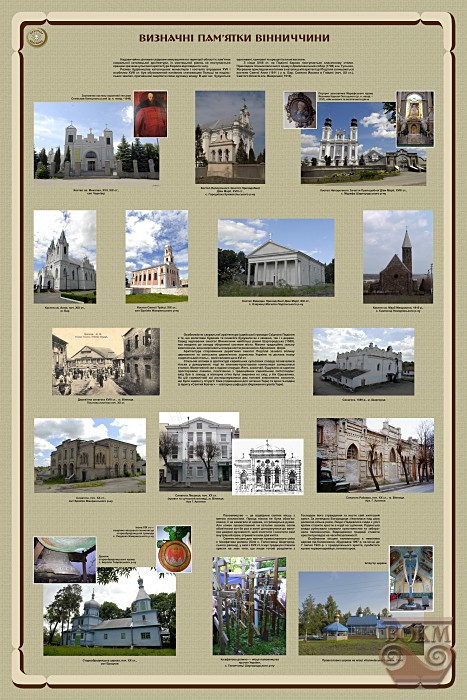 «Перлини сакральної архітектури». Тривале співіснування різних конфесій залишило на Вінниччині три основні види культових споруд — православні, католицькі та юдейські. Тому цей розділ знайомить з історією створення, розповідає про особливості архітектури та оздоблення православних (дерев’яних й мурованих) та католицьких храмів і монастирів, юдейських молитовних домів, церков старообрядницьких громад. Серед них Михайлівська церква смт Дашів Іллінецького району, Преображенська церква с. Поличинці Козятинського району, Лядовський скельний монастир Могилів-Подільського району, Успенський собор Гранівського монастиря с. Тишківська Слобода Гайсинського району, костьол Непорочного Зачаття Пресвятої Діви Марії с. Мурафа Шаргородського району, костьол Потоцьких у Печері, синагога в м. Шаргород та багато інших.