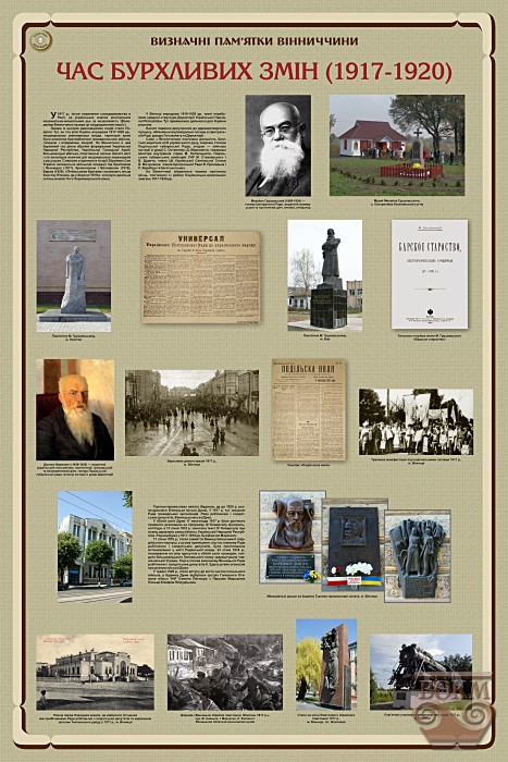 «Час бурхливих змін». В цьому розділі виставки розповідається про пам’ятки та події одного з найскладніших періодів в історії України – 1917-1920 рр. Одним із центрів революційних подій стало Поділля. Тут впродовж 1917–1920-х рр. неодноразово змінювалася влада, перебували урядові структури УНР, діяли регулярні війська та повстанці, гриміли криваві бої. Вміщено підрозділи, в яких йдеться про «Білу залу», Мури, готель «Савой» у м. Вінниця, пам’ятки, пов’язані з іменами М. Грушевського, Я. Гандзюка, Д. Марковича тощо.