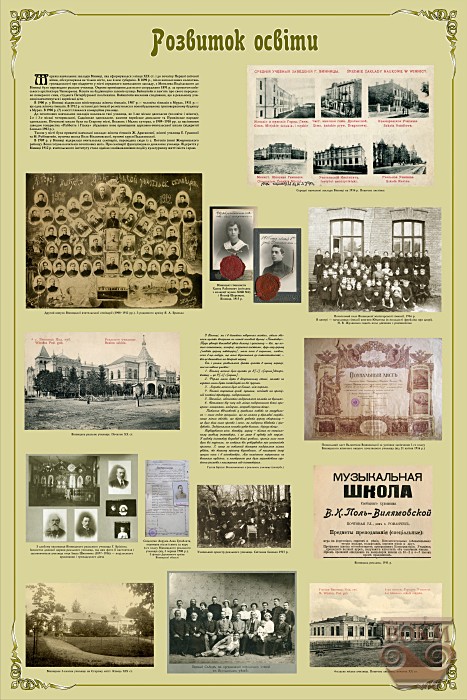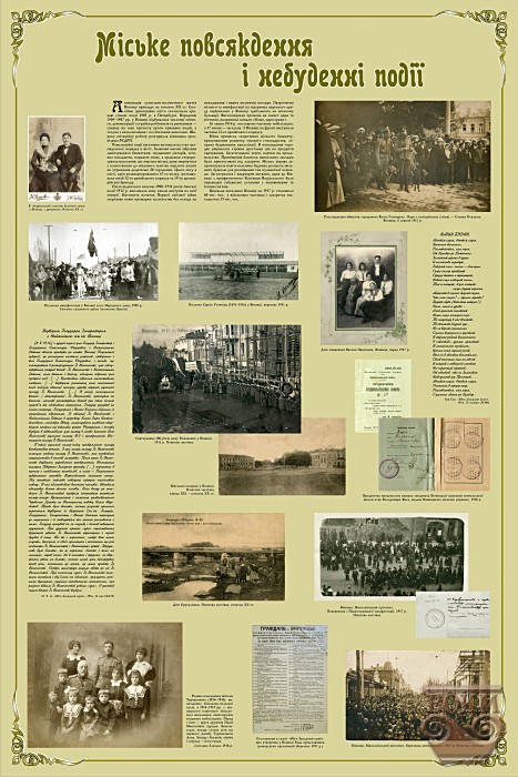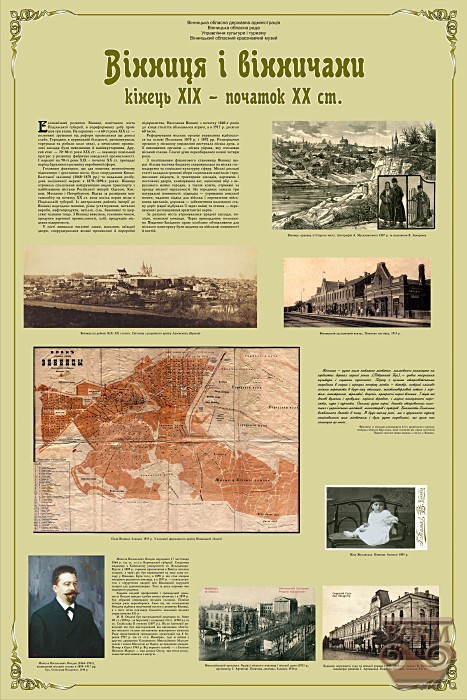 Виставка висвітлює особливості зростання Вінниці на рубежі ХІХ і ХХ століть, розвиток промисловості й торгівлі, планування і забудову міста, його господарство, санітарний стан і розвиток медицини, мережу навчальних закладів, культурне життя і дозвілля вінничан, міське повсякдення і небуденні події. Вона створена за матеріалами Вінницького обласного краєзнавчого музею, Державного архіву Вінницької області, з приватних колекцій.